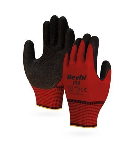 - • Siyah lateks kaplamalı kırmızı dikişsiz polyester örme crincle eldiven